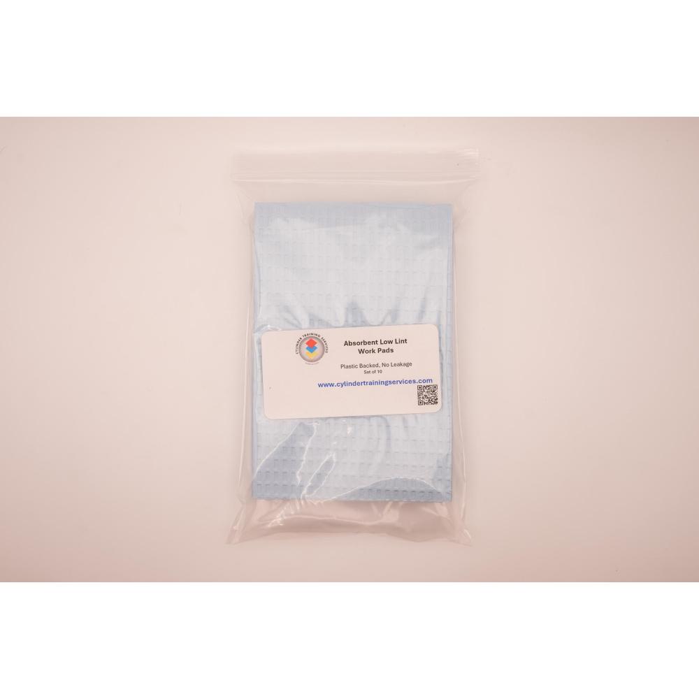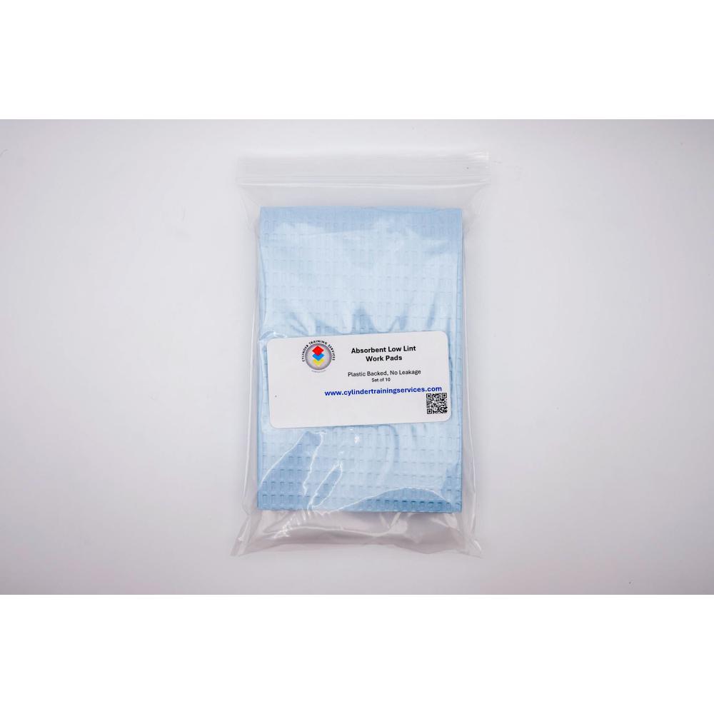 Low-lint, plastic-backed pads measuring 12" × 16" for use on technician work benches. Quickly absorb liquids without leakage, helping keep work areas clean and reducing the risk of hydrocarbon cross-contamination. Package includes 10 pads.