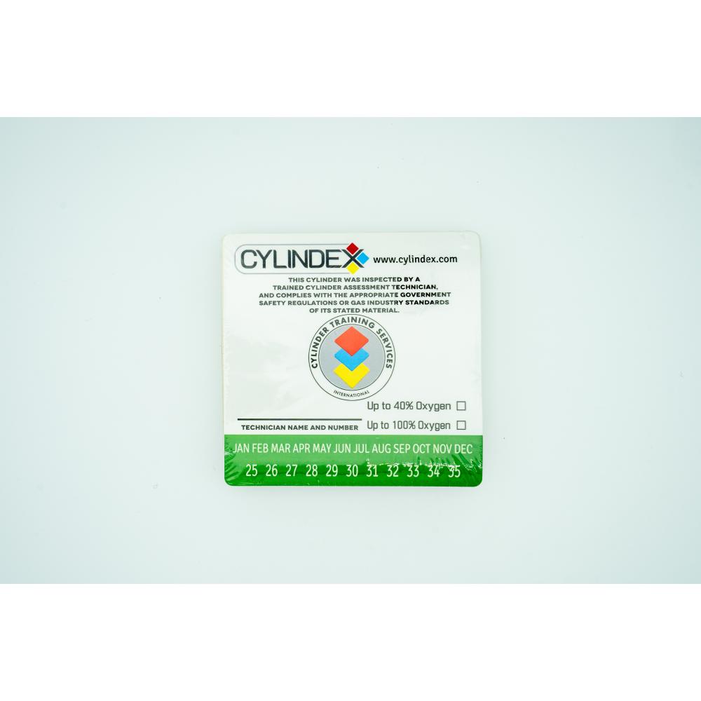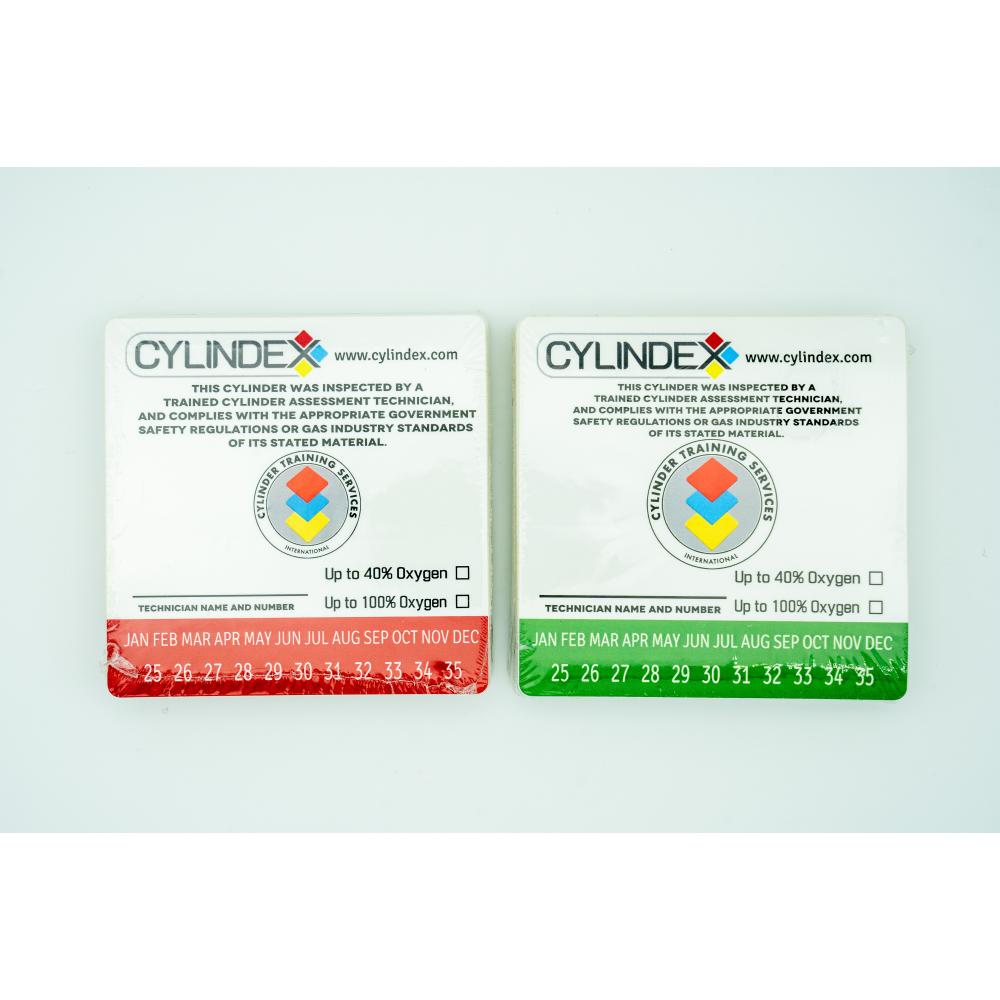 Durable stickers for recording annual visual inspections of high-pressure air cylinders. Each sticker includes fields for inspection month and year, oxygen compatibility, and the C.A.T. specialist’s certification number and name. Stickers are valid only when fully completed and are accepted by reputable fill stations worldwide. Pack of 50, available in red or green (both compatible for oxygen cleaning).